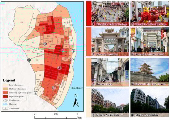 Finally, the visualization results of each indicator were weighted and superimposed on the map to obtain the distribution pattern of the value space of the historic landscapes of Chaozhou Ancient City (Figure 10), which was classified into four classes based on the road network with the mean value processing method (Figure 11).