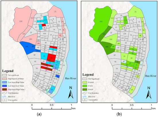 Using ArcGIS Pro 3.3.1 and GeoDa 1.22 software to carry out spatial metrological analysis, we determined that there are significant non-equilibrium and coupling in the distribution of the layer space and value space of the historic landscapes of Chaozhou Ancient City (Table 8). The Moran’s I indexes of the layer space and value space, respectively, are 0.2712 and 0.6437, with the Z values both above 2, which indicates that the layer space and value space both have the characteristics of agglomerative spatial distribution, and the degree of agglomeration of the value space distribution is much higher than that of the layer space distribution. Based on the bivariate LISA spatial distribution map (Figure 12a), the high–high agglomeration is mainly distributed in the Kaiyuan Temple space in the central part of the ancient city, as well as in the spaces of Jia Di Lane, Yang Yu Lane, and the Residence of the Xu Emperor’s Son-in-Law in the north. This is mainly because these areas have retained intact cultural relics and buildings and have been effectively revitalized and utilized, with a high level of consistency between the high-layer and high-value assessment of historic landscapes. The low–low agglomeration is mainly distributed in the surrounding spaces of Guowanggong Lane and Dayin Street in the west of the ancient city, which have mostly been converted into modern buildings, with low historical layering; these areas are far away from the center of the ancient city, presenting the characteristics of low layer and low value. The low–high agglomeration is mainly distributed in the spaces around Kaiyuan Road in the central part of the ancient city, and the spaces around the Residence of the Xu Emperor’s Son-in-Law in the north. The high–low agglomeration is mainly reflected in the natural environmental elements in the north and northwest parts of the ancient city. Based on the bivariate LISA significance level (Figure 12b), the low–high agglomeration in the center, the low–low agglomeration in the west, and the high–low agglomeration showed extremely significant correlation (p < 0.01), while the other spaces showed significant correlation (p < 0.05).