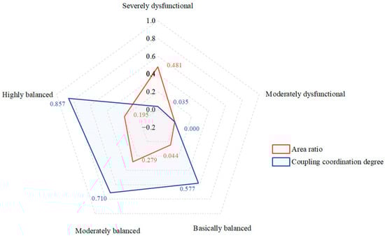 In Formulas (5)–(7), refers to the coupling degree; and refer to the composite indices of layer space and value spaces; represents the composite index between the two systems; and the weights α and β are undetermined coefficients, and their sum should be 1. This study contends that the two subsystems of layer space and value space are equally important in ancient cities, hence α = β = 0.5; denotes the coupling coordination degree, with a higher value indicating a higher degree of coordination. It is determined by the difference between the composite indices of the two indicators to define the three dimensions of coupling coordination type (Table 3) [56].