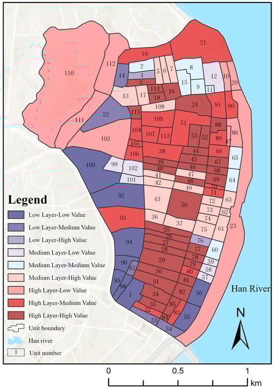According to the above four layering characteristics of the historic landscape, the “single-land-use dynamic degree model” was used to analyze the degree of change in the historic landscape elements from the Sui–Tang dynasties to the Song–Yuan dynasties, from the Song–Yuan dynasties to the Ming–Qing dynasties, from the Ming–Qing dynasties to the Republic of China, and from the Republic of China to the modern era in combination with the division of land parcels in the study area (Figure 8). To further clarify the scope of the landscape layer spaces of the Chaozhou Ancient City, the types of continuous, juxtaposed, coverage, and attenuated layering were assigned scores of 4, 3, 2, and 1, respectively, from highest to lowest (Table 4). After grid overlay, a historical landscape layering degree classification map is obtained, reflecting the continuity of historic landscapes in different spaces along the time dimension (Figure 9). The results showed that the high-layer space and the relatively high-layer space accounted for 66.1% of the total area of the ancient city, exhibiting the strongest spatiotemporal continuity and the most significant layering characteristics, and these were the core areas of Chaozhou Ancient City’s historic landscape. The medium-layer space was mainly distributed along Kaiyuan Road in the central part of the ancient city and in some spaces in the north, accounting for 18.5% of the total area. The low-layer space was mainly distributed along the Huancheng West Road in the south, accounting for 15.4% of the total area.