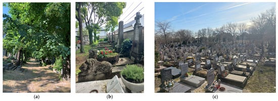 Budafok Cemetery: (a) linden tree alley, (b) crypts, and (c) new cemetery sections (authors’ pictures).