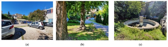 Péterfy Sándor Street Hospital: (a) parking, (b) garden, and (c) ornamental fountain (authors’ pictures).