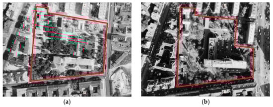 Budafok Cemetery: (a) aerial photo from 1967 (fentrol.hu) and (b) aerial photo from 1990 (fentrol.hu).