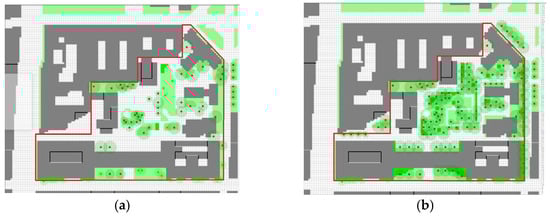In hospital gardens, the paving can be rationalized to a large extent by displacing parking from the plot or by creating underground parking, and so the green areas can be increased significantly, but also, paving with lower albedo or permeability can reduce long-wave radiation, which can result in a more favorable thermal environment. In general, there is scope to increase the woody plant cover within the site, so that by greatly increasing the canopy coverage or using water features, the climate can be influenced favorably. In our research, we found similar results to models run for other institutional gardens [48,50].