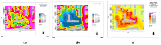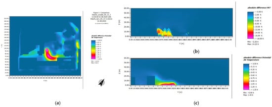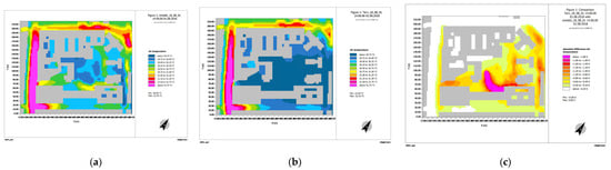 Physical equivalent temperature (PET) simulation of the garden of the Péterfy Sándor Street Hospital in summer: (a) existing garden model, (b) proposed garden model, and (c) comparison of the two models (authors’ figure created with ENVI-met).