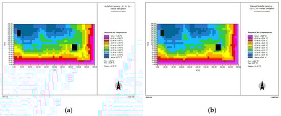Material uncertainty: The default building albedo and insulation as a typical option within ENVI-met may deviate from actual cemetery structures. For example, historic limestone crypts could reduce wall temperatures by 2–3 °C versus the modeled values.