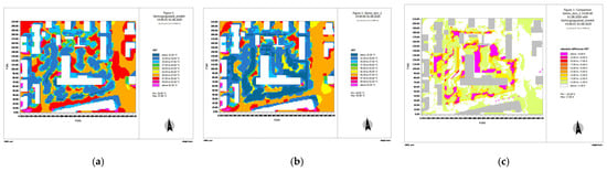 The observations and values of the microclimatological studies (potential air temperature, wind, potential humidity) are summarized in the PET, i.e., the physical equivalent temperature maps, which clearly show that the reduction of the physical equivalent temperature (PET) between the planned and existing situations in the hospitals has been achieved in both cases. The physical equivalent temperature (PET) reduction can be as high as 20 °C in cases where the canopy growth is significant (Figure 17c). This contributes greatly to the well-being of users.