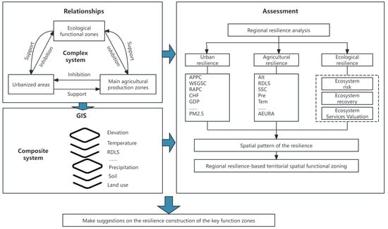 To address these dual limitations, this study proposes a GIS-based functional integration framework that quantifies resilience through spatial interactions across three core zones: (1) urbanized areas (economic density, infrastructure robustness); (2) major agricultural production zones (production stability, soil conservation); and (3) ecological functional zones (biodiversity, water/air purification). This approach uniquely quantifies cross-functional dependencies, such as the impacts of urban sprawl on agricultural resilience. It provides the first operational model that aligns regional resilience assessment with China’s spatial governance imperatives.