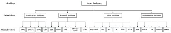 The urban resilience assessment framework integrates 20 indicators across four dimensions (see Figure 3), building on established methodologies [36,62,63,64]. The indicators were categorized into four dimensions as follows:
