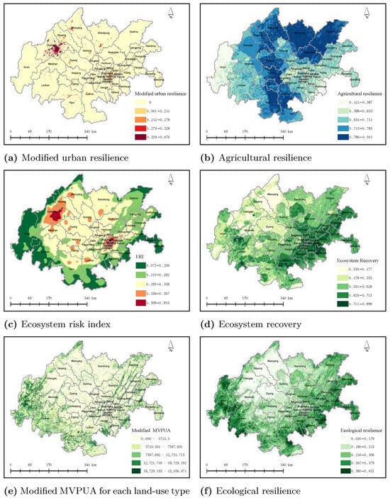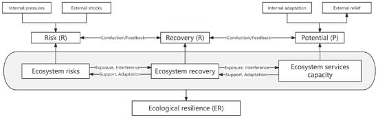 It is important to note that, in this study, ‘ecological resilience’ refers to a composite metric integrating ecosystem risk, recovery capacity, and ecosystem service value, rather than the traditional ecological resilience concept focused solely on the ability of ecosystems to recover from disturbances [28,29]. This multidimensional approach enables a more comprehensive evaluation of ecological functions within the regional context.