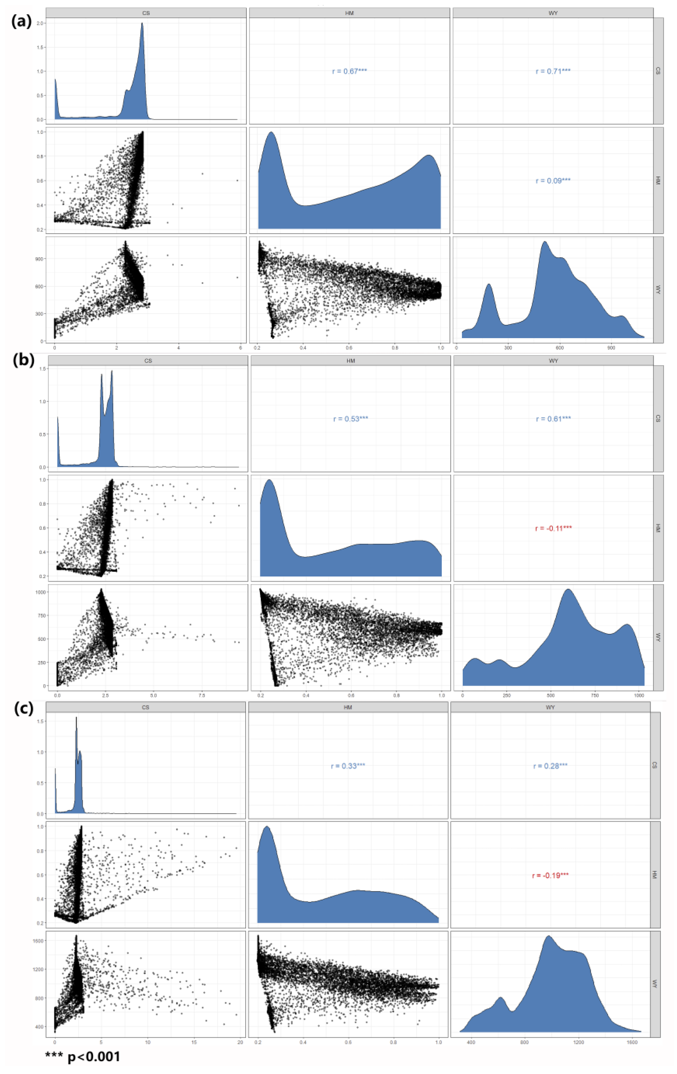 (2) Dynamic trade-off trajectories. The antagonism between WY and HMI intensified with impervious-surface expansion, but localized synergies emerged where roadside and rooftop vegetation were introduced. CS–HMI and CS–WY relationships shifted from widespread conflict (2000) to broad synergy (2020) once peri-urban afforestation exceeded cropland losses, indicating that land-use zoning, rather than economic intensity per se, governs multi-service outcomes.