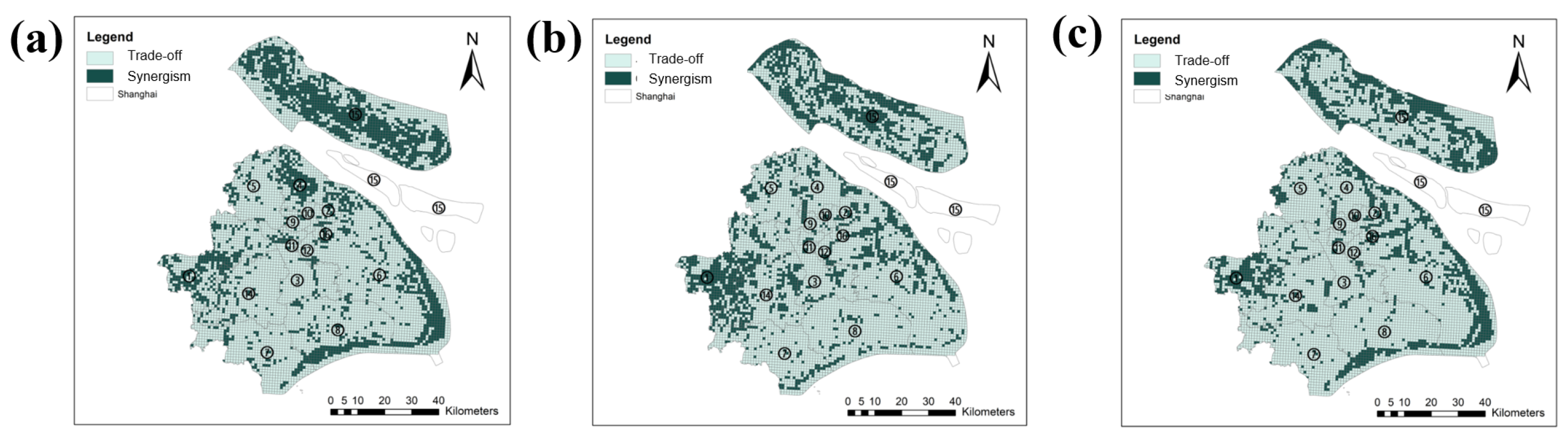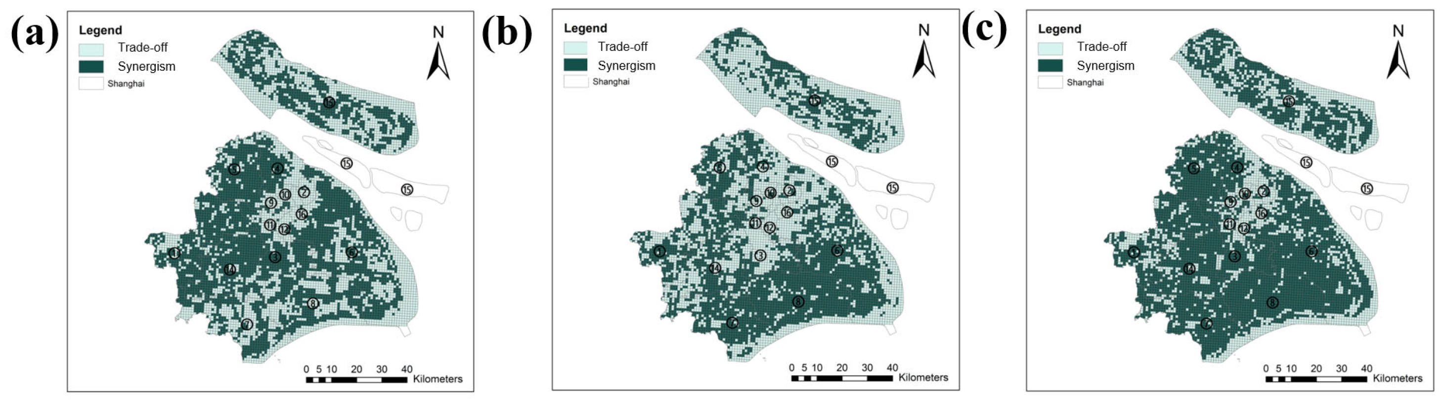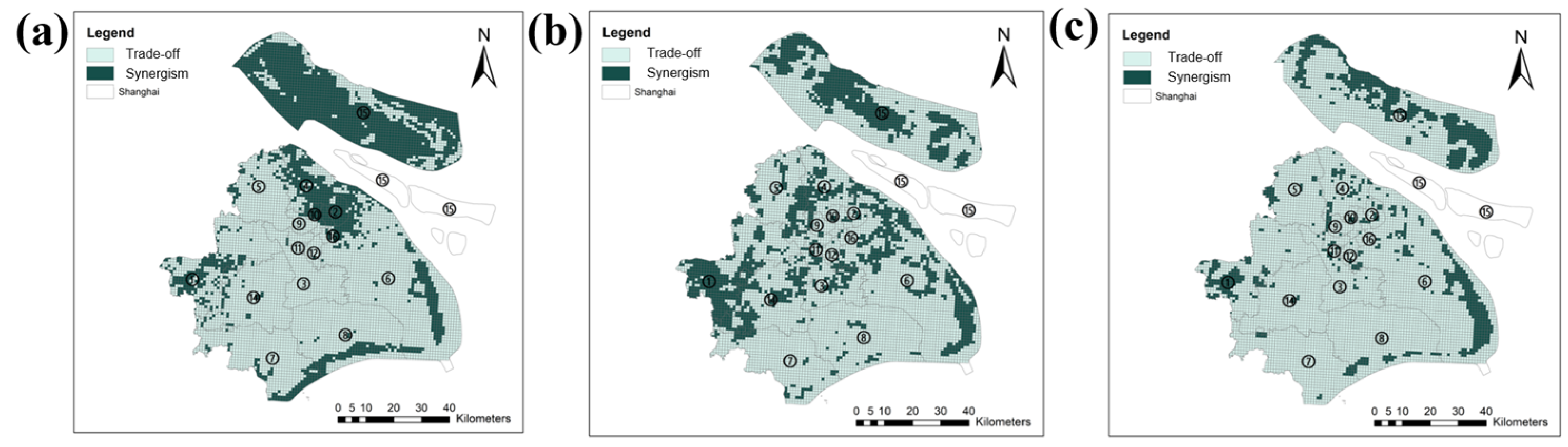 22], often overlooking the relationships between changes during dynamic development processes. For instance, ecosystem services exhibiting an overall trade-off relationship might display synergistic changes within specific spatial and temporal scales—a dynamic relationship that has not been adequately explored in existing studies. Some research indicates that shifts in land use and policy can trigger transformations in ES trade-offs and synergies [