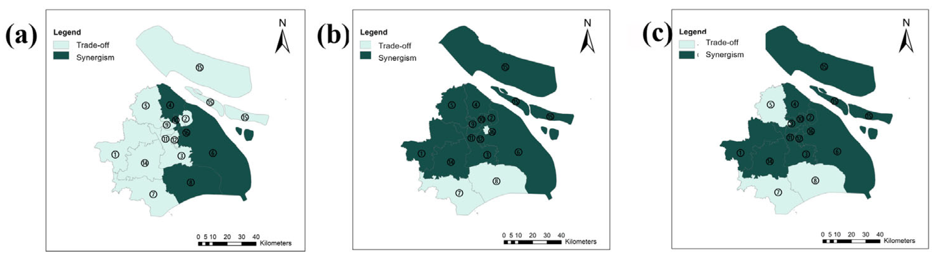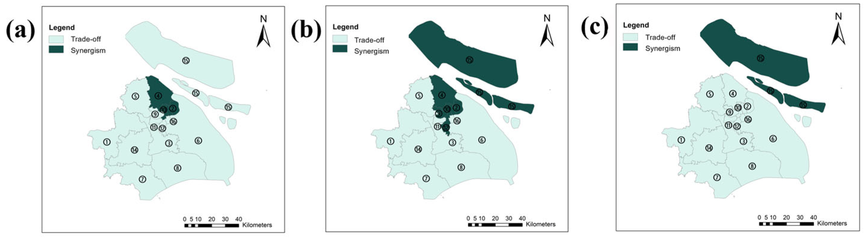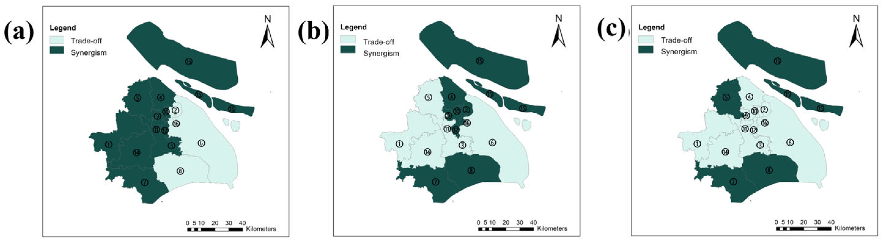 22], often overlooking the relationships between changes during dynamic development processes. For instance, ecosystem services exhibiting an overall trade-off relationship might display synergistic changes within specific spatial and temporal scales—a dynamic relationship that has not been adequately explored in existing studies. Some research indicates that shifts in land use and policy can trigger transformations in ES trade-offs and synergies [