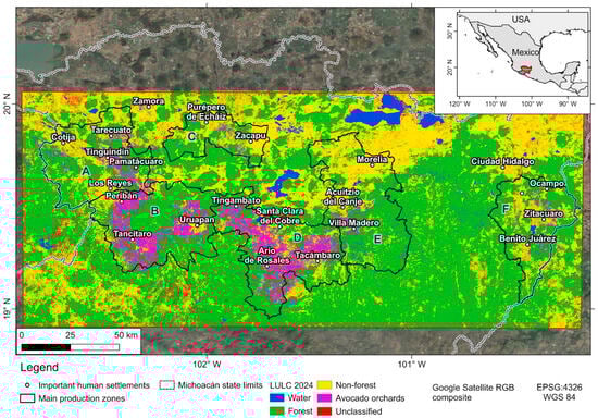The “Avocado Belt” is located in the Trans-Mexican Volcanic Belt and the Balsas River Basin. In addition, the 2024 LULC map is shown along with the main avocado production zones (indicated by A–F uppercase letters). The red rectangle indicates the extent of the study area.