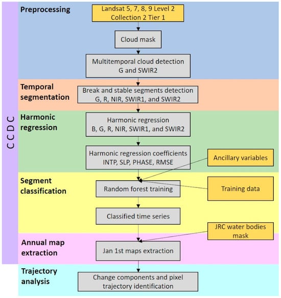 The Continuous Change Detection and Classification (CCDC) algorithm [49] was used to detect changes and classify the study area. All the CCDC processes were run inside Google Earth Engine [66] using its corresponding implementation [67]. Since CCDC is a pixel-oriented approach, all steps are performed at a pixel level, including the detection of breaks and stable segments, as well as the LULC classification.