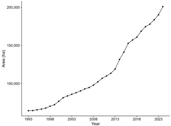 In 1993, the estimated area covered by avocado orchards was 64,304.28 ha, while at the end of the study period, this area occupied 200,938.32 ha (obtained by pixel counting; Figure 3). The general pattern showed a slower area expansion during the first half of the study period, while an accelerated expansion was particularly noticeable after 2014 (Figure 3).