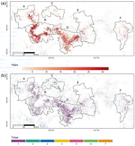 (a) The number of years an area showed avocado orchard presence in the 1993–2024 period. (b) The number of times an area showed a change in the avocado orchard class. Areas that show a one-time presence correspond to orchards that were already established by 1993 or that were converted to avocado orchards once and remained as such. The main avocado production zones are indicated by A–F uppercase letters.