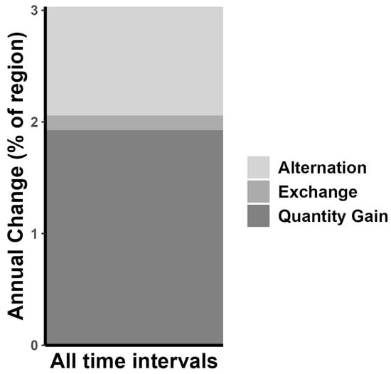 Our results show that the study area is a highly dynamic area with an average annual change of 3% of the unified size (i.e., all the places that were avocado orchards at some point in the time series; Figure 5). Since the most significant component of change was quantity gain, the absolute net change was positive, meaning that avocado orchards increased in area from 1993 to 2024 (Figure 5). The average annual rate of quantity gain in the avocado orchard area was almost 2% (1.92%) of the unified size. The following dominant process of change was alternation, which approximately corresponds to 1% of the average annual change (0.97%) of the unified size. Finally, exchange contributed to a tiny fraction of the observed change, representing almost 0.13% of the unified size.