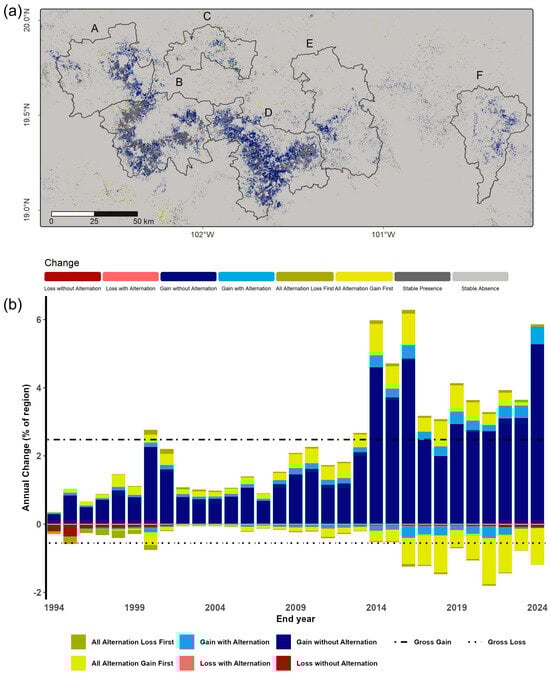 (a) Map of the eight classes of permanence/change. (b) Temporal trajectories of avocado orchards from 1993 to 2024. Additionally, the net gross gain and loss rates are shown in dotted lines. The main avocado production zones are indicated by A–F uppercase letters.