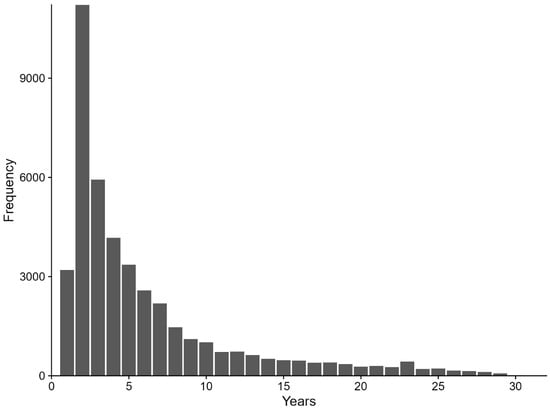 Most of the avocado orchards that appeared in the pixels with an alternating trajectory (i.e., loss with alternation; gain with alternation; all alternation, gain first; and all alternation, loss first) persisted for 2 years (Figure 7). This shows that a large proportion of alternating avocado orchards had a relatively short persistence, with a higher probability of being caused by mapping errors. However, at least half of the cases (median = 4 years) showed a persistence of four or more years, indicating a lower probability of being caused by mapping errors.