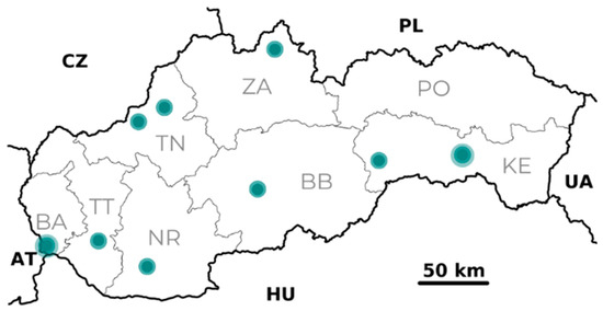Location and distribution of studied CIs within Slovakia (indicated with green dots in the map). Bordering countries of Slovakia are the Czech Republic—CZ; Poland—PL; Ukraine—UA; Hungary—HU; and Austria—AT. Eight self-governing regions of Slovakia: Bratislava region—BA; Trnava region—TT; Trenčín region—TN; Žilina region—ZA; Banská Bystrica region—BB; Poprad region—PO; Košice region—KE.