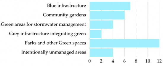 Six distinct categories of NBSs (Table A4) were used as analytical indicators: blue infrastructure, productive gardens, green areas for stormwater management, grey infrastructure integrating green, parks and other green spaces, and intentionally unmanaged areas. NBSs may be implemented at a small scale; for example, pocket parks, community gardens, or tree-lined streets. They may also be realised at a larger scale, such as through city-level projects involving the creation of green corridors, riverbank restoration, or the adoption of city-wide biodiversity strategies that incorporate multiple green space elements [45,50].