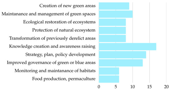 According to Colding [51], active citizenship contributes to urban GI creation and maintenance, as well as activates the local communities by enhancing social cohesion and environmental awareness [52,53]. Citizen and stakeholder participation in NBS has been reported as crucial for the success of those solutions. Such participation usually involves people and organised groups that can influence the decision-making processes [42]. The study analyses the activities (Figure A1) of 17 case studies engaging in NBSs (Figure A2).
