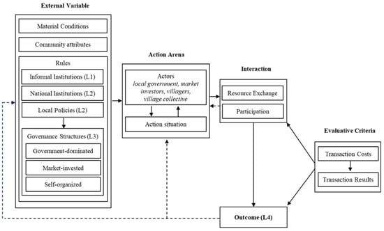 Moreover, to open the “black box” of institutions, Williamson’s hierarchical framework delineates four levels of analysis: (1) embedded informal institutions (L1), (2) formal institutional environments (L2), (3) governance structures (L3), and (4) resource allocation outcomes (L4). This framework demonstrates how informal norms (L1), formal rules (L2), and governance mechanisms (L3) collectively shape institutional performance (L4). Notably, since formal institutions (L2) operate across multiple scales, formal rules encompass both national policies and local regulations. Finally, all three upper levels (L1–L3) interact to form dynamic, multi-tiered institutional systems. At the governance level (L3), Transaction Cost Economics provides a valuable analytical tool for comparative institutional assessment. Embedding the Institutional Analysis Framework by Williamson into the IAD framework, this research constructs a more comprehensive framework to examine the governance performance as well as the influential factors (Figure 1).