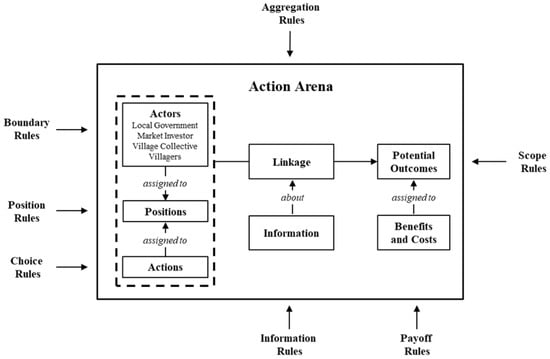 The Institutional Analysis and Development (IAD) framework provides a robust analytical lens for examining and comparing governance structures. Developed by Ostrom [20], this approach centers on the concept of “action arenas” comprising action situations and participating actors. Moreover, material conditions, attributes of the community, and rules have a fundamental influence on the action arena and the interactions of participants, finally generating resource allocation outcomes. Through this framework, Ostrom systematically demonstrates how these factors collectively determine resource allocation outcomes while elucidating the comparative advantages of decentralized governance structures in managing common-pool resources.