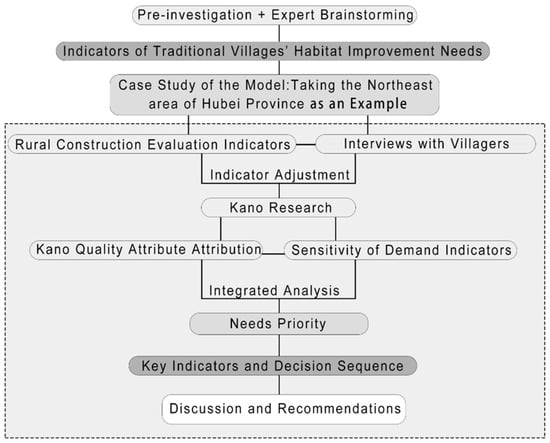 To systematically address these gaps, this study proposes a mixed-methods framework (Figure 1) integrating both expert knowledge and villager perspectives. The framework comprises four key phases: Indicator Identification: Initial indicators of habitat improvement needs are established through literature review, pre-investigation, and expert brainstorming; Field Validation & Refinement: Indicators are tested and adjusted via case studies (Northeast Hubei) and structured interviews with villagers; Demand Prioritization: The Kano model attributes quality characteristics to each indicator and quantifies demand sensitivity using the Better–Worse coefficient, enabling prioritization based on impact on villager satisfaction; Decision Support: An integrated analysis synthesizes findings to identify key improvement priorities and sequences for actionable recommendations. In summary, the Kano model can assist in exploring villagers’ needs and expectations and formulating appropriate policies to improve the quality of traditional village habitat and villagers’ satisfaction. The proposed framework (Figure 1) operationalizes this by translating localized needs into a hierarchical decision sequence.