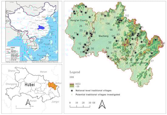 The study area is the three counties of the central part of China, which is located at the junction of the three provinces of Hubei, Anhui, and Henan, backed by the Dabie Mountain range, and contains Hong’an, Macheng, and Luotian counties. The area is historically famous as a revolutionary base, with many traditional historical buildings, traditional villages, revolutionary heritage, relics, and so on, which contain great cultural value and are worthy of preservation and development in patches [39]. The object of this study explicitly contains 112 villages (Figure 2).