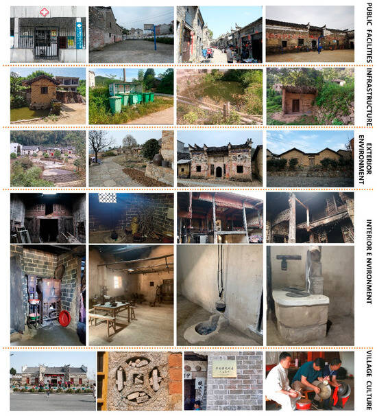 As the transmission of history and memory in rural revitalization, the core of the conservation and development of traditional villages needs to revolve around the villagers’ central consciousness rather than mere material space. Retaining memories requires integrating capital logic and cultural logic into the social life scenes of villages [14] and meeting villagers’ needs for a better living environment based on preserving the historical appearance. The research found that the following common problems exist in the study area (Figure 6): poor drainage and waste disposal infrastructure, poor quality of public space at village entrances and streets, some buildings in disrepair and need of repair, low level of interior modernization, and hollowing out of villages. Based on this, the following discussion is conducted to improve the quality of the habitat of traditional villages, increase villagers’ satisfaction and better promote the development and construction of villages.