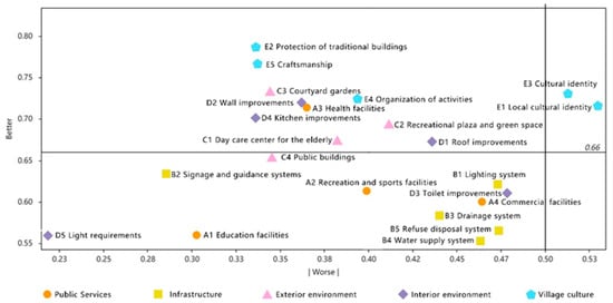 From the comprehensive analysis of the data, it can be seen that the five primary needs are ranked as E (village culture) > C (exterior environment) > D (interior environment) > B (infrastructure) > A (public services). Among the desired attributes, the ranking is E2 (traditional building conservation), E3 (cultural identity), D1 (roof improvement), D3 (toilet improvement), A4 (commercial facilities), and B5 (waste disposal system); there are more indicators of charm attributes, the first three are E1 (regional cultural identity), E5 (artisan spirit) and E4 (event organization). The latter is C3 (courtyard gardens), D2 (roof improvements), C2 (recreational plaza green areas), A3 (sanitary facilities), B1 (lighting systems), D4 (kitchen improvements), C1 (day care centers for the elderly) and C4 (public buildings) respectively. The last five are B3 (drainage improvement systems), A2 (recreational and sports facilities), B4 (tap water supply systems), B2 (signage and guidance systems), and A1 (educational facilities). Among the non-differentiated attributes, D5 (light demand) is an indicator that villagers do not care about.
