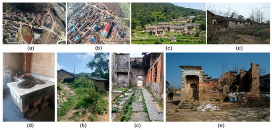 Photos of the village research site. (a) Poor drainage and waste disposal infrastructure; (b) poor quality of public space; (c) buildings in disrepair; (d) low level of interior modernization; (e) hollowing out of villages (taken by the authors).