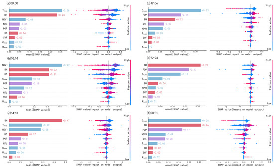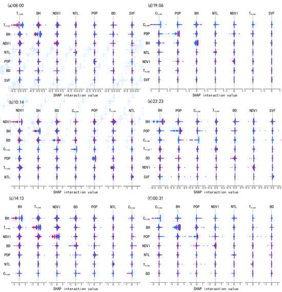 - Daytime (08:00–14:13), where TPLAND, NDVI, and BH were the top three factors, although their order varied. These patterns suggest a strong association between vegetation, building height, and LST during daytime hours.