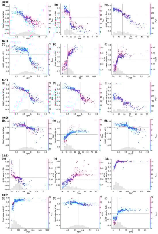 - Diurnal variation in the importance of blue–green infrastructure, urban morphology, and human activity variables: Blue–green space variables had the strongest influence on daytime LST, with NDVI ranking first in relative importance at 10:14 and TPLAND ranking first at 08:00, indicating that vegetation significantly reduced daytime LST through evapotranspiration and shading. Urban morphology variables were more influential at night, with BH ranking first at both 14:13 and 22:23, suggesting that tall buildings affect LST differently through shading in the daytime and heat storage at night. Human activity variables contributed significantly to nighttime LST increases, with POP ranking second and third at 19:06 and 00:31, respectively, implying that population-related heat emissions from energy use and traffic substantially elevate nocturnal LST.