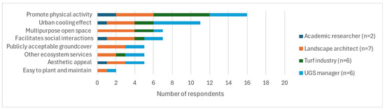 Several advantages associated with lawn in PUGS were apparent in the interview responses (Figure 4). The primary advantage mentioned by 16 of the 21 respondents was the promotion of physical activity, including sport and physically active recreation. The promotion of physical activity was mentioned by all four respondent types. The following are examples: