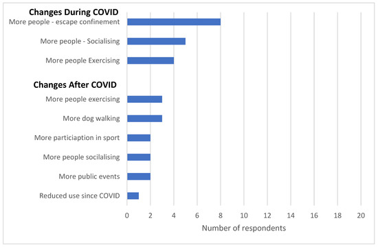 Most respondents focused on changes in the use of PUGS lawn during COVID-19 restrictions rather than after restrictions had ceased, mainly regarding people accessing PUGS to escape the confinement of their homes (participants A3, M1, M2, M3, M4, M5, R2, T4) (Figure 11). The following are examples: