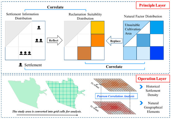 Historical settlement density is used to replace reclamation suitability as the core medium for correlation analysis of natural factors. The theoretical logic is constructed in the Principle Layer, and data quantification is implemented in the Operation Layer. The two layers cooperate to complete the analytical closed loop of “from natural factors to human—land relationships”, providing a foundation for subsequent exploration of the driving factors for cultivated land development. Based on the above logic, a “historical settlement density-reclamation suitability-natural factor” correlation analysis framework is constructed. The specific operations are divided into two steps: