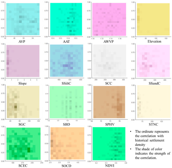 By analyzing the scatter distribution of historical settlement density and physical geographic element indicators (Figure 3), it is found that there are physical geographic elements within each region that show a certain correlation with the reclamation intensity, reflecting the influence degree and rules of different elements on human reclamation activities and settlement distribution.