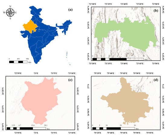 Location of the study area and spatial extent of the selected semi-arid heritage cities in Rajasthan, India: (a) India map highlighting the state of Rajasthan; (b) administrative boundary of Udaipur city; (c) administrative boundary of Jaipur city; and (d) administrative boundary of Jodhpur city.