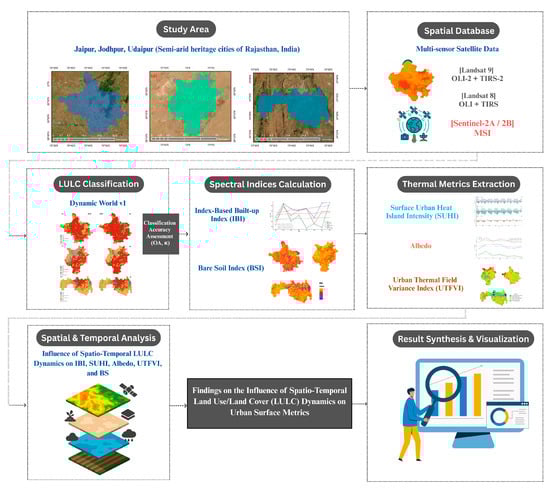 Flowchart showing the methodological framework adopted to evaluate land use/land cover (LULC) dynamics and their influence on urban thermal and environmental parameters in semi-arid heritage cities.