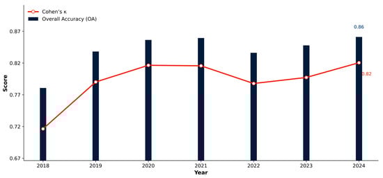 Annual trends of OA with its 95% CI (Equation (4)) and κ (Equation (3)) are shown in Figure 3, while the 2024 row-normalized confusion matrix with class-wise recall (Equation (2)) is presented in Figure 4.