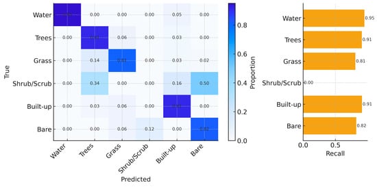 Across all cities combined, OA increased from ~0.78 in 2018 to ~0.86 in 2024, while κ rose from ~0.72 to ~0.82 (Figure 3). Confidence bands around OA are narrow, indicating stable year-to-year performance. Class-wise results for 2024 (Figure 4) show high separability for Water, Built, and Trees (recall ≈ 0.95, 0.94, and 0.91, respectively), moderate performance for Grass (≈0.81), and lower recall for Bare (≈0.84). Shrub/Scrub exhibits the weakest producer’s accuracy (near 0 in 2024), reflecting spectral confusion with Grass and Bare in semi-arid settings and limited reference support. Off-diagonal concentrations in Figure 4 are primarily along the Grass-Bare and Grass-Trees pairs, consistent with seasonal phenology and soil exposure.