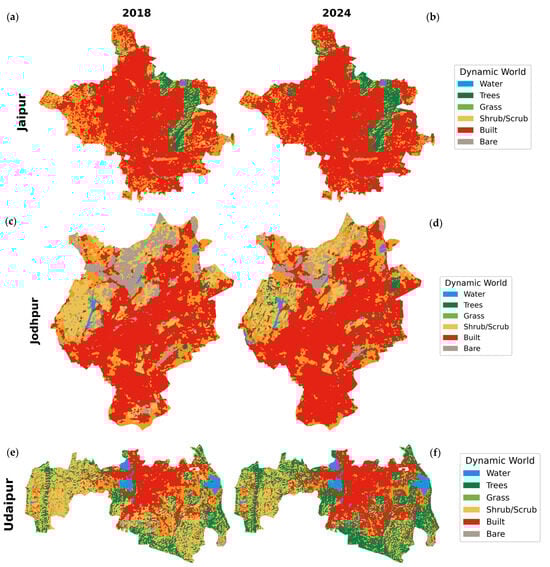 Land use/land cover (LULC) maps of Jaipur ((a) 2018, (b) 2024), Jodhpur ((c) 2018, (d) 2024), and Udaipur ((e) 2018, (f) 2024).