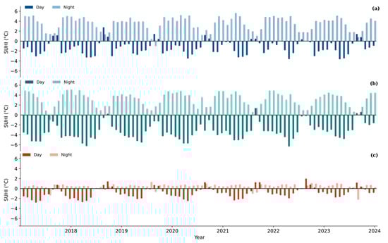 Similarly, an investigation in Tehran—a representative semi-arid metropolis—reported maximum daytime urban–rural LST differences of −4 K, which inverted to a positive nighttime SUHI exceeding +3.9 K [26]. These findings validate that in semi-arid landscapes, daytime urban cooling and nighttime heat retention coexist, reflecting the strong influence of land surface characteristics, soil moisture deficits, and vegetation dynamics. Such diurnal asymmetry challenges the conventional SUHI paradigm, underscoring the necessity of accounting for climate zone and land cover context when assessing urban thermal environments.