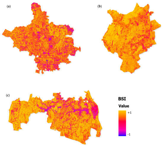 Spatial distribution of the BSI in Jaipur: (a), Jodhpur (b), and Udaipur (c) for the study period.