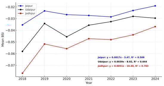 Temporal trends in BSI for Jaipur, Udaipur, and Jodhpur from 2018 to 2024.