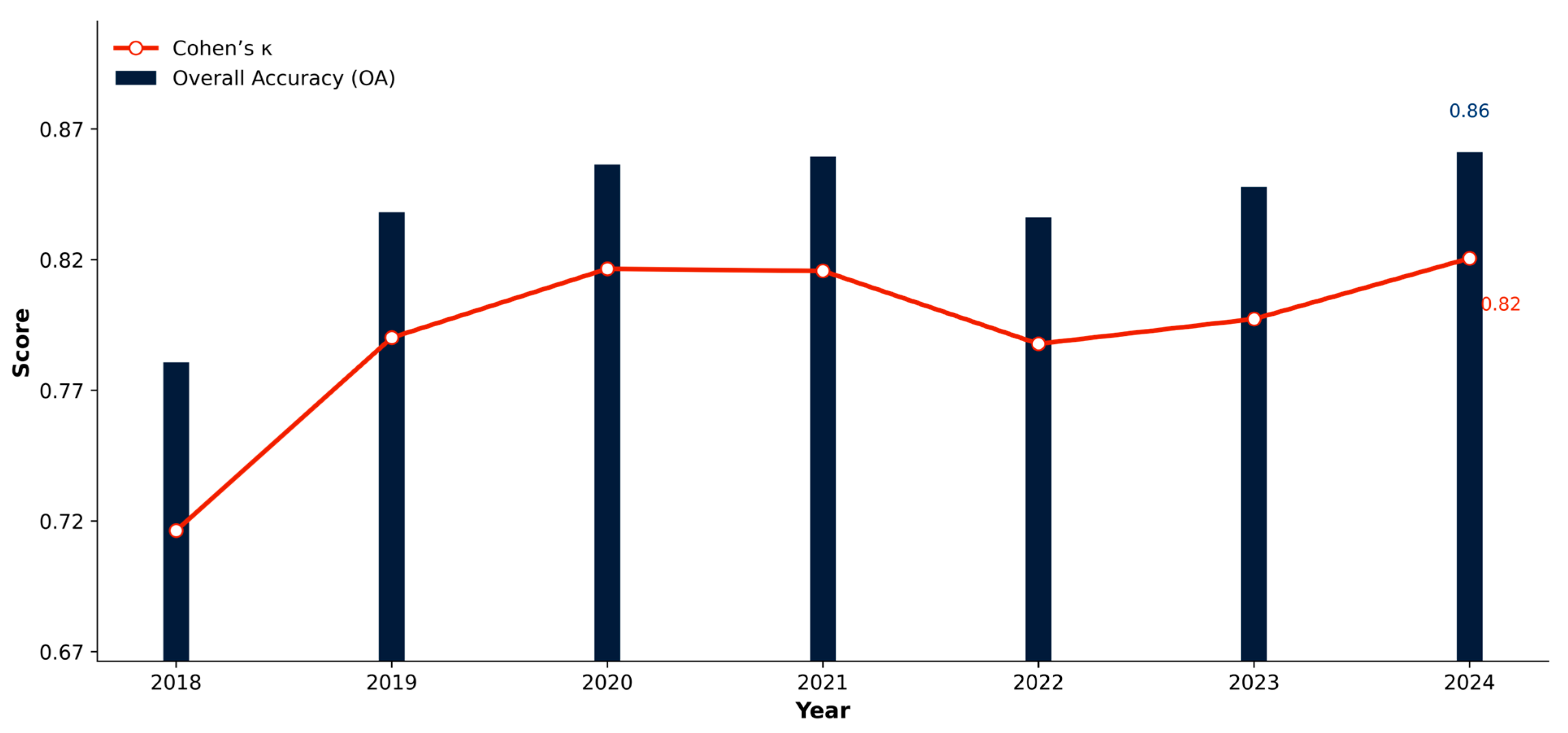 Landsat 8/9 C2 Level 2 | Landsat 8 OLI/TIRS Landsat 9 OLI-2/TIRS-2 | USGS/NASA | 30 m | 2018–2024 |