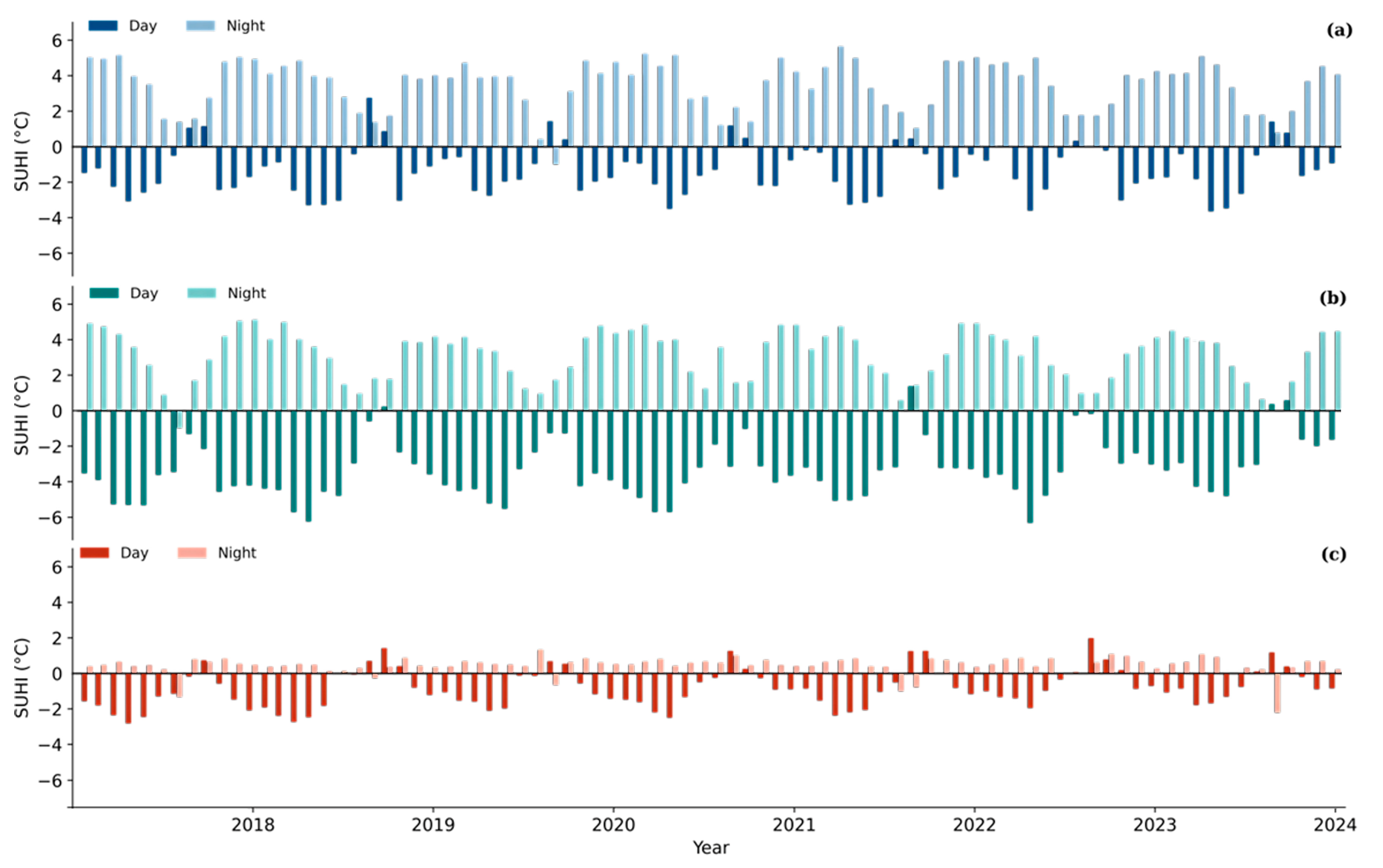City SUHI | Series (Day/Night) | Sen’s Slope (°C yr−1) | OLS Slope (°C yr−1) | MK_τ | MK_Z | p (Two-Sided) |